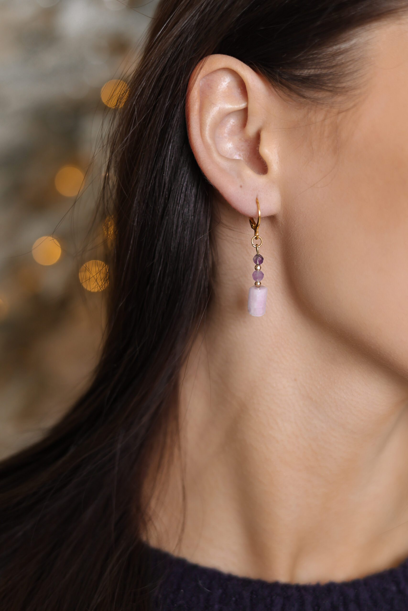 Te kolczyki to subtelny talizman spokoju, miłości i emocjonalnej harmonii. Połączenie duchowego ametystu, czułego kunzytu i uziemiającego hematytu tworzy biżuterię, która pomaga wyciszyć umysł, otworzyć serce i utrzymać równowagę w codziennym życiu. Ręcznie wykonane i osadzone na antyalergicznym zapięciu ze stali chirurgicznej — idealne do noszenia na co dzień.