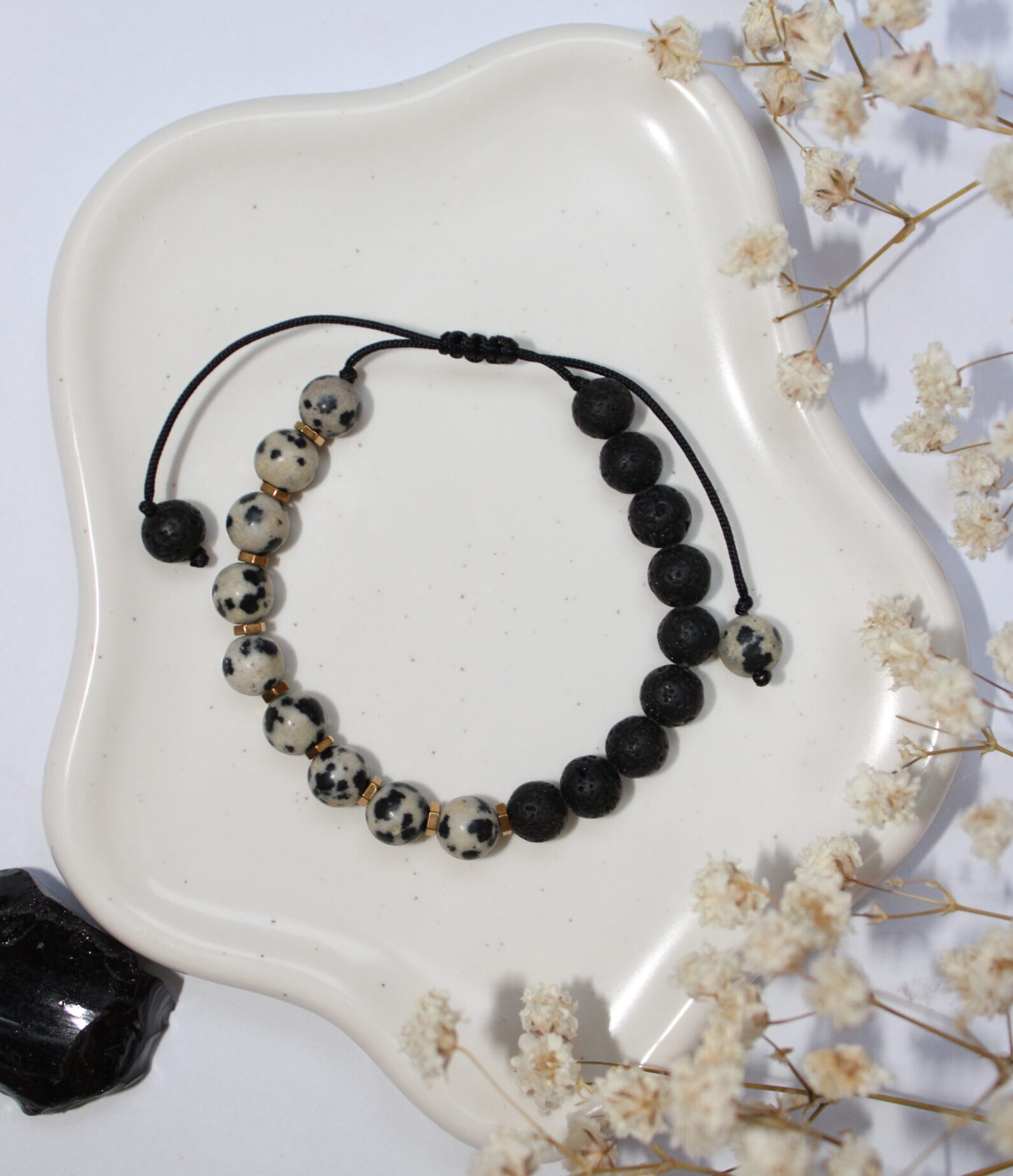 Ta bransoletka to wyważony talizman dwóch żywiołów — radości i surowej mocy — spleciony w jednej, silnej formie. Po jednej stronie radosny, energetyczny jaspis dalmatyński, po drugiej pierwotna, uziemiająca lawa wulkaniczna, a całość spina metaliczny blask hematytu. To biżuteria dla osoby, która chce jednocześnie czuć lekkość dnia i stać mocno w obliczu wyzwań. Ręcznie wykonana, pełna intencji i naturalnej energii.