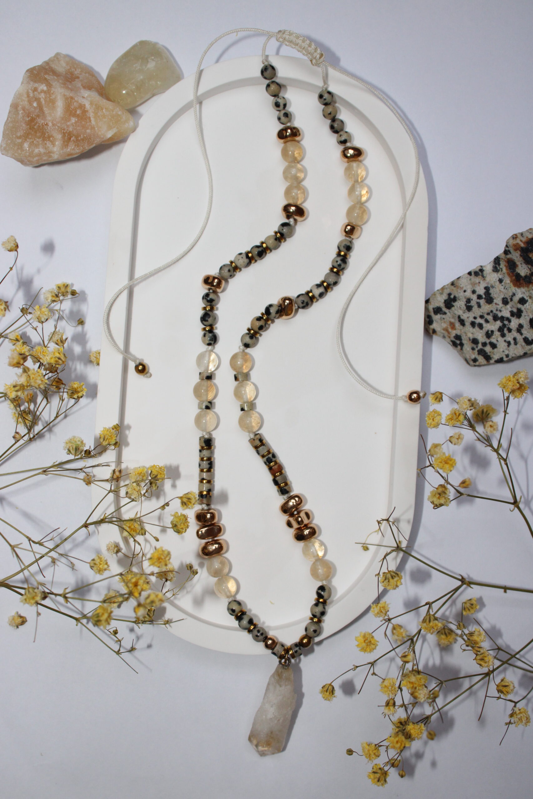 Ten naszyjnik to talizman kobiecej mocy, radości i harmonii, stworzony dla kobiet, które chcą przyciągać do swojego życia obfitość, lekkość i pozytywną energię. Połączenie słonecznego cytrynu, wesołego jaspisu dalmatyńskiego i eleganckiego hematytu tworzy kompozycję, która nie tylko zachwyca wyglądem, ale także wspiera rozwój osobisty i wewnętrzny spokój. Ręcznie wykonany z naturalnych minerałów, emanuje ciepłem, stabilizacją i energią nowych możliwości.